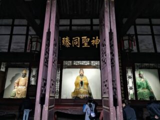 武侯祠の敷地は15万㎡、東京ドーム約3個分に相当する広さです。竹林に赤い壁が映える小道は、蜀の時代を彷彿とさせます。しかし、やはり何と言っても劉備、関羽、張飛の3人の像が並んでいるところは圧巻です。