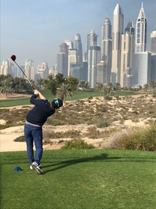超高層摩天楼ビル群に向かって打つゴルフ@エミレーツゴルフクラブ、は圧巻です。前方には世界一高層階なアパートのプリンセスタワー、100階越え。個人的には低層階での居住がお勧めです。たまに発生するエレベーター停止、とても100階から降りたり、登ったりはできません。(筆者撮影) |