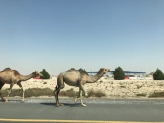 ドバイ・アブダビ間の大動脈高速道路に突然現れたラクダたち。 今や、人口雨で洪水もよく発生しています。 (筆者撮影) |