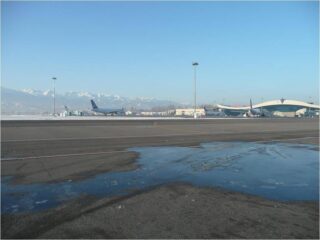 中部国際空港―ソウル(インチョン)―アルマティ空港(カザフスタン、写真1)間はアシアナ航空、カザフスタン国内はエアーアスタナで移動、季節風の状況で差があるが、ソウル-アルマティ間は、約6~7時間のフライト。3社のA社:アルマティ―シムケント、B社:アルマティ―アスタナーコスタナイ、C社:アルマティ―アクトベ間を移動した。
