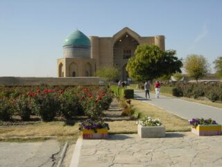 写真1、2はアルマティ空港及びアルマティ市郊外の撮影で、遠くに天山山脈が見え、アルマティーシムケント間は天山山脈に沿って約1.5時間のフライトである。天山山脈は、中国から北上して、モンゴルやカザフスタンの草原(ステップ地帯)を通り、アラル海やカスピ海の北側から黒海に至るかつての歴史的な交易路シルクロードと関係があり、長安-天山回廊の交易路網はユネスコの世界遺産に登録されている。
