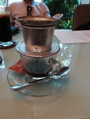 ベトナムコーヒーを注文すると、小さめのコーヒーカップの上に、ベトナムコ-ヒー用の金属製のフィルターが乗ったままで出てきます。日本のコーヒーのように、直ぐに飲める状態では出てきません。フィルターにコーヒーを入れてお湯を注ぎ、全てのお湯が落ち切るのを待ちます。注いだお湯が落ち切るまでに10〜20分ほどかかるので、じっくりと待つ必要があります。一滴一滴、ろ過されたコーヒーが落ちていくのを、のんびり楽しむのです。